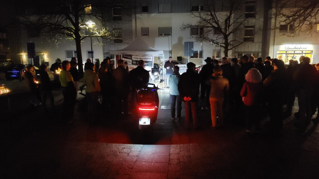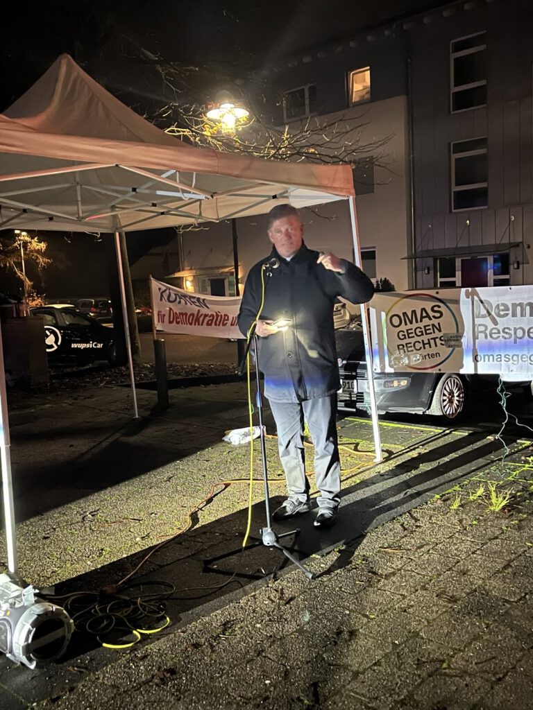 Unterstützt vom Verein für Demokratie und Vielfalt Kürten entstand eine besonders eindrucksvolle Atmosphäre: Kerzen erleuchteten den Platz, weiße Stoffstreifen flatterten im Wind, und sanfte Klezmerklänge begleiteten die Redebeiträge. Durch das Programm führte Leo Wulf, Sprecher des Vereins, der die Gäste herzlich begrüßte und die Bedeutung des Abends hervorhob.