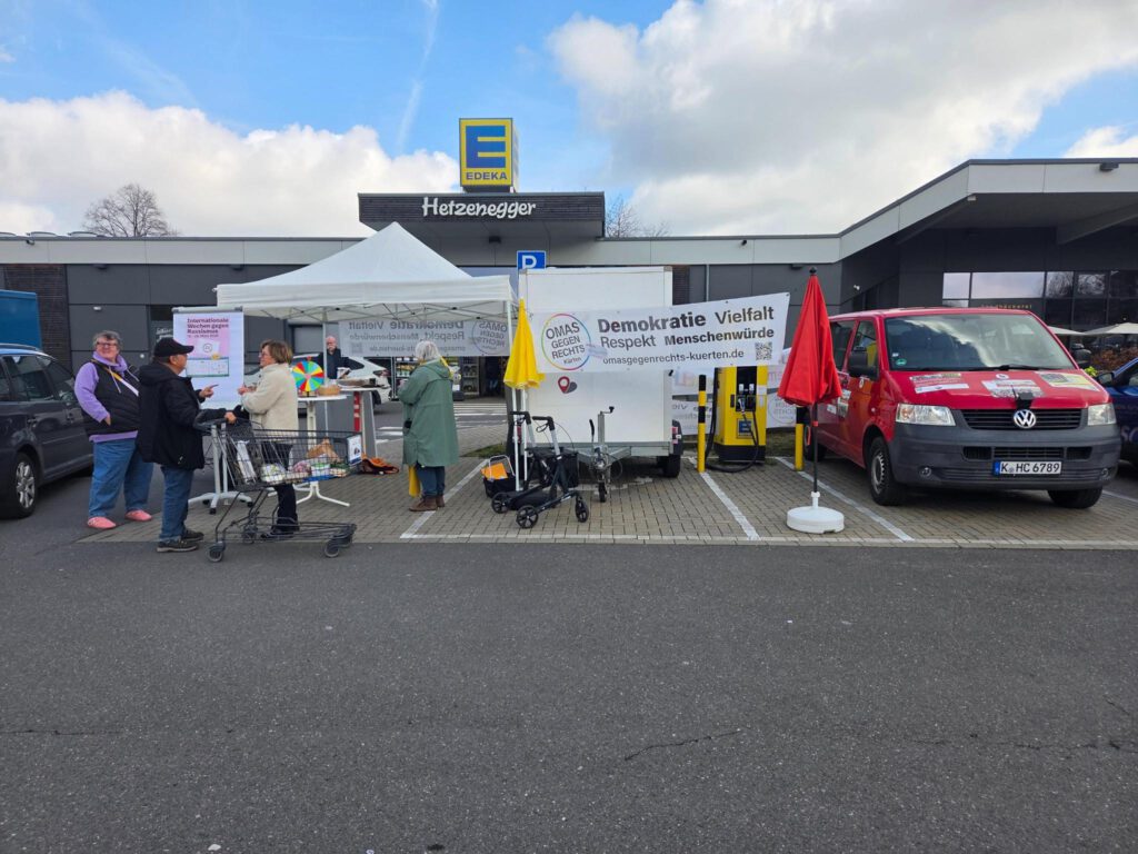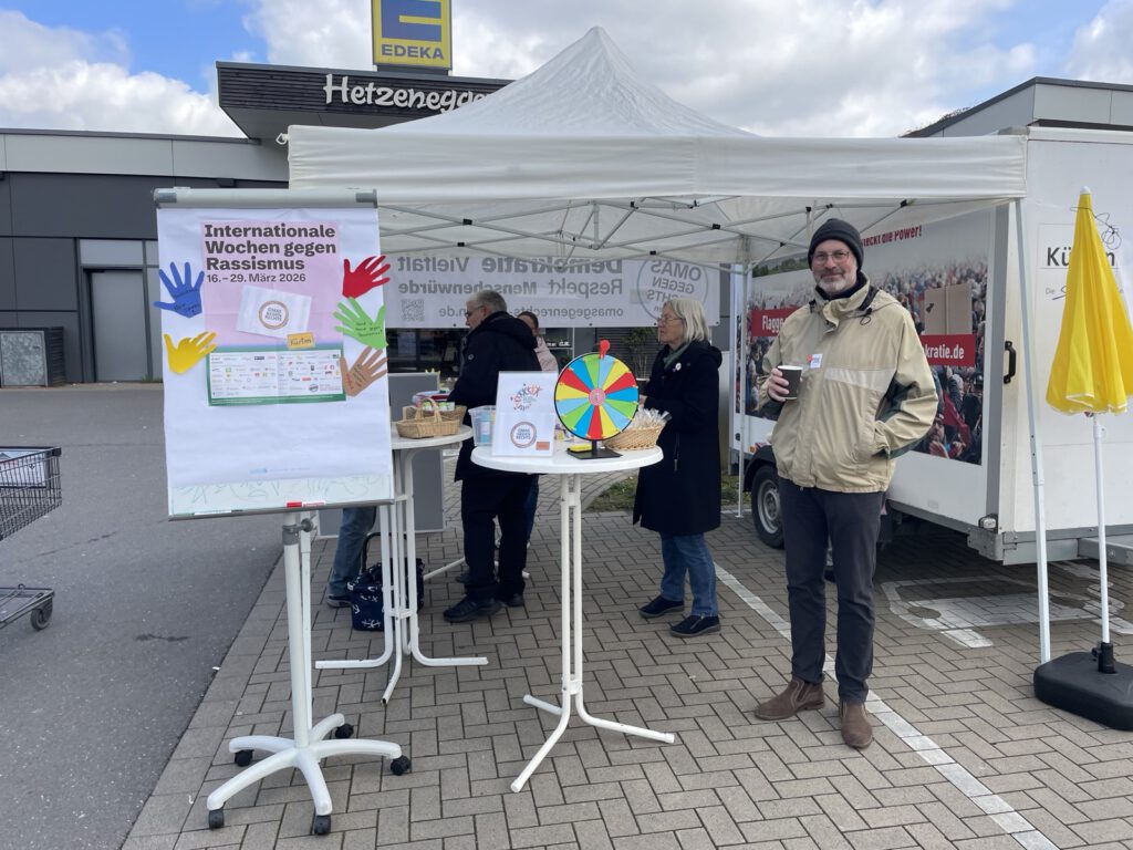 Kürten-Dürscheid. Mit einem Infostand auf dem Kundenparkplatz des Edeka-Marktes Hetzenegger hat die OGR Kürten am 27. März 2026 ein sichtbares Zeichen zum Abschluss der Internationalen Wochen gegen Rassismus gesetzt. Unterstützt und mit organisiert wurde die Aktion vom Verein für Demokratie und Vielfalt Kürten e.V., der insbesondere durch seinen Vorstandssprecher Leo Wulf maßgeblich zum Gelingen beitrug. Mit umfangreichem Equipment sorgte er vor Ort für die praktische Umsetzung des Infostands.
